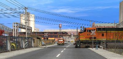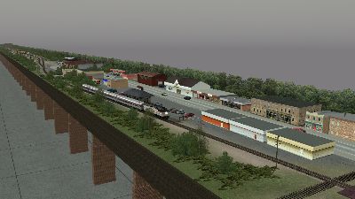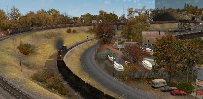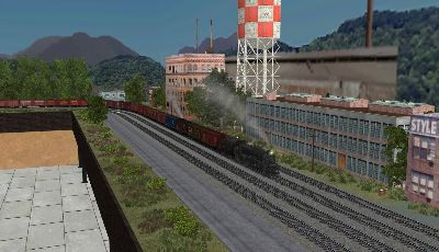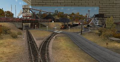 TS2012 comes with several layouts and a wide variety of locomotives and rail cars but perhaps the best thing is you can create your own layouts without being limited by the size of your garage or basement. The pictures below are from my own Elko and Lincoln RR. I used only buildings, track, trees, roads, automobiles and stuff that comes with the program but the amazing part is there is allot more stuff on the Trainz "download station" created by fellow Trainz nuts (trainzers) and ready for download. Once your master layout is completed you can upload it to the download station for others to use.