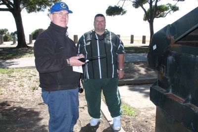 About 2 pm, when the hunt was to end, and after Bob volunteered to run back up the hill and retrieve the transmitter ( THANK YOU so VERY much Bob) and the hunters had left for Fisherman's Hut in San Lorenzo to chow own and debrief some more, except Ron who had to get a haircut, we heard again from Gary. He was in the park near the picnic area directly below us. We asked him to wait there for us but he didn't hear. With the transmitter still on in the car, we drove down to meet Gary only to find him half way up a trail to the knob and wondering why the signal was now coming from behind him. We then turned the transmitter off and invited Gary down the hill to join us. After debriefing him and discovering that he was in slow traffic all the way through San Francisco and across the Bay Bridge and that he had driven 90 miles, we awarded him the sticktoittism award. Unfortunately he wasn't able to join us in San Lorenzo.