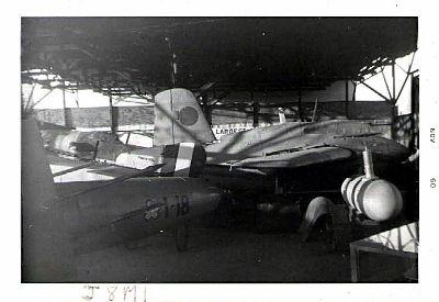 Mitsubishi J8M1 rocket powered interceptor. Japanese version of the German Me 163B. Note nose of a Japanese Baka Bomb, a piloted "cruise missile"on the left. This was taken at "The Air Museum" in 1959.