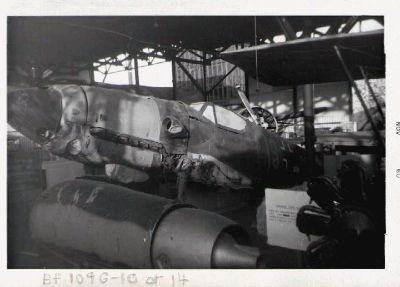 German Me 109G sans wings at "the Air Museum" in 59. I believe the jet engine at the bottom is from a Hienkiel "Volks fighter". The aircraft on the right may be a Hanriot (WWI). A P-26 can be seen in the background.